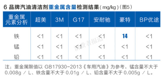 結(jié)果顯示,6個品牌鐵、錳、鉛等在此次檢測中均小于1mg/kg,即未檢出,只有豪特的鐵含量為14mg/kg。參與檢測的實驗室工程師表示,6款產(chǎn)品的重金屬元素含量都不算高,而對比起每次加油時使用的汽油清潔劑用量,這些重金屬的實測含量可作忽略不計。