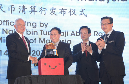 4月14日,在馬來(lái)西亞普特拉賈亞,馬來(lái)西亞總理納吉布、中國(guó)銀行行長(zhǎng)陳四清、中國(guó)駐馬來(lái)西亞大使黃惠康和馬來(lái)西亞交通部長(zhǎng)廖中萊(從左至右)出席馬來(lái)西亞人民幣清算行啟動(dòng)儀式。 當(dāng)日,中國(guó)銀行馬來(lái)西亞吉隆坡人民幣清算行啟動(dòng)儀式在普特拉賈亞舉行。