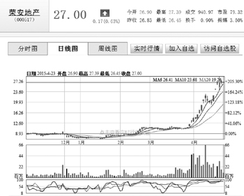 與公司業(yè)績大幅下滑相對應(yīng)的卻是公司股價的大幅上漲。從3月27日到4月23日,短短18個交易日,榮安地產(chǎn)在利潤下滑97%的背景下,其股價竟從10.75元的開盤價一路上行,直到27元的收盤價,其漲幅高達(dá)151.16%,尤其是在4月8日,榮安地產(chǎn)發(fā)布2015年一季報業(yè)績下滑97%以上的當(dāng)天,股價竟然漲停,4月9日公司股價再次漲停。