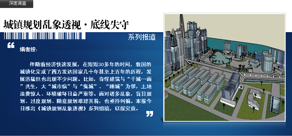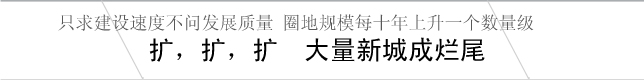 盲目規(guī)劃致新城失控 新城強調(diào)增量規(guī)劃,通過粗線條的膨脹來贏得發(fā)展,這在創(chuàng)造機遇的同時也帶來驚人的浪費。專家和規(guī)劃人員認為,各地新城出現(xiàn)盲目規(guī)劃、無序擴張等問題,根子在部分地方干部發(fā)展心態(tài)走偏。 |