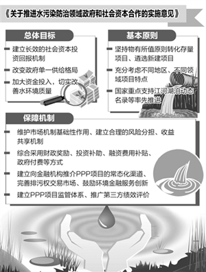 財(cái)政部和環(huán)保部日前聯(lián)合發(fā)布《關(guān)于推進(jìn)水污染防治領(lǐng)域政府和社會(huì)資本合作的實(shí)施意見(jiàn)》(以下簡(jiǎn)稱《意見(jiàn)》),對(duì)于下一步水污染防治領(lǐng)域政府和社會(huì)資本合作(PPP)項(xiàng)目操作流程作出明確規(guī)范。記者從相關(guān)部門獲悉,從目前情況來(lái)看,下一步國(guó)家將細(xì)化社會(huì)資本投資環(huán)保治理領(lǐng)域的鼓勵(lì)措施,包括財(cái)政、稅收、貸款優(yōu)惠等內(nèi)容。與此同時(shí),環(huán)保部將完善水污染防治領(lǐng)域特許經(jīng)營(yíng)管理制度,降低準(zhǔn)入門檻,清理審批限制,拓寬社會(huì)資本投入渠道。