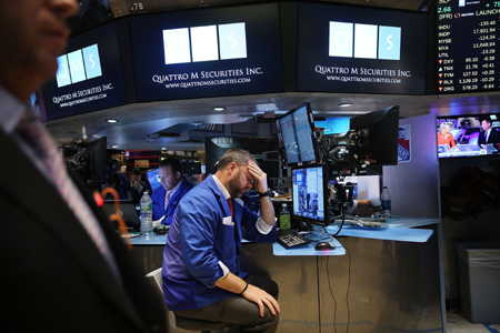 受經(jīng)濟(jì)數(shù)據(jù)不佳等因素影響,全球主要股市5日普跌。美國紐約股市道瓊斯工業(yè)平均指數(shù)收于17928.20點,跌幅為0.79%;標(biāo)準(zhǔn)普爾500種股票指數(shù)收于2089.46點,跌幅為1.18%;納斯達(dá)克綜合指數(shù)收于4939.33點,跌幅為1.55%;倫敦股市《金融時報》100種股票平均價格指數(shù)收于6927.58點,跌幅為0.84%;德國法蘭克福股市DAX指數(shù)收于11327.68點,跌幅為2.51%。圖為5日交易員在美國紐約證券交易所工作。