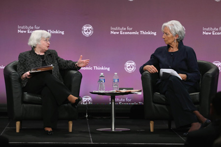 當(dāng)?shù)貢r(shí)間5月6日,美國(guó)首都華盛頓,國(guó)際貨幣基金組織總裁拉加德(右)和美聯(lián)儲(chǔ)主席耶倫出席對(duì)話活動(dòng)。 耶倫表示,盡管低利率環(huán)境容易導(dǎo)致金融冒險(xiǎn)活動(dòng)增加,但目前美國(guó)金融穩(wěn)定風(fēng)險(xiǎn)仍處于溫和水平,沒(méi)有明顯提升。