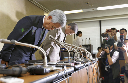 6月1日,日本年金機(jī)構(gòu)理事長(zhǎng)水島藤一郎(左)在東京參加新聞發(fā)布會(huì)時(shí)鞠躬致歉。