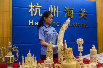 5月28日,杭州海關(guān)宣布,今年已先后破獲利用進出境旅檢、郵遞渠道走私瀕危動物制品大案,查獲象牙270余公斤。圖為杭州海關(guān)工作人員正在清點查獲的走私象牙,其中不少是精美的工藝品。
