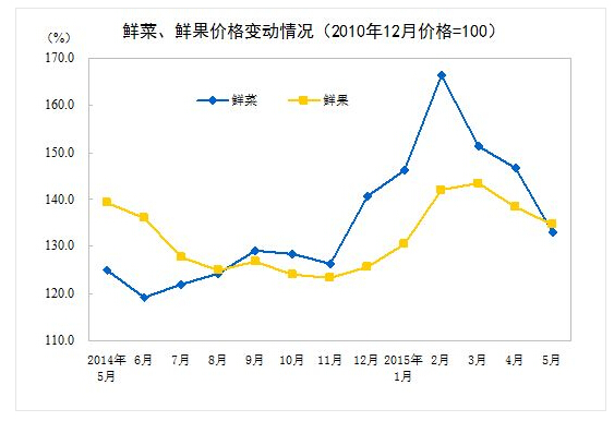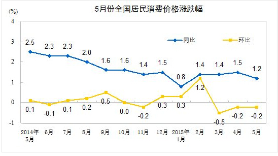 2015年5月份,全國居民消費(fèi)價(jià)格總水平同比上漲1.2%。其中,城市上漲1.3%,農(nóng)村上漲1.0%;食品價(jià)格上漲1.6%,非食品價(jià)格上漲1.0%;消費(fèi)品價(jià)格上漲0.9%,服務(wù)價(jià)格上漲2.1%。1-5月平均,全國居民消費(fèi)價(jià)格總水平比去年同期上漲1.3%。