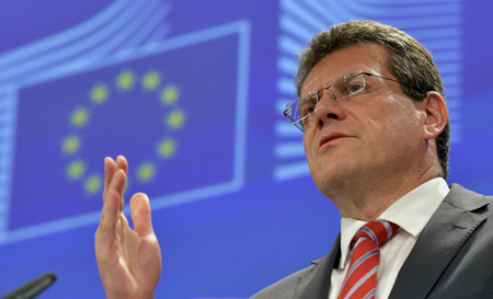 7月1日,在比利時布魯塞爾,歐盟委員會副主席馬羅什·謝夫喬維奇召開關(guān)于烏克蘭、俄羅斯和歐盟三方天然氣問題談判的新聞發(fā)布會。 烏克蘭石油天然氣公司當(dāng)天發(fā)表聲明說,即日起暫停向俄羅斯天然氣工業(yè)股份公司購買天然氣。聲明強調(diào),俄羅斯向歐盟出口的天然氣將繼續(xù)過境烏克蘭進行輸送。