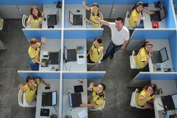 貨車幫創(chuàng)始人戴文建在貴陽(yáng)貨車幫科技有限公司內(nèi)與員工一起合影。記者 歐東衢 攝 |