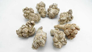 真品三七——類圓錐形或圓柱形,表面灰褐色或灰黃色,頂端有莖痕,周圍有瘤狀突起,俗稱“猴頭三七”。