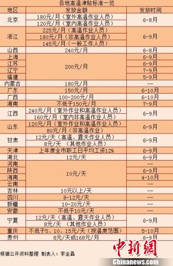 其中,北京高溫津貼發(fā)放時(shí)間為每年6月至8月,室外露天作業(yè)人員高溫津貼每人每月不低于180元,在33℃(含33℃)以上室內(nèi)工作場(chǎng)所作業(yè)的人員高溫津貼每人每月不低于120元;上海高溫津貼發(fā)放時(shí)間為每年6月至9月,標(biāo)準(zhǔn)為每月200元;廣東高溫津貼發(fā)放時(shí)間為6月份至10月份,標(biāo)準(zhǔn)為每人每月150元;湖南發(fā)放時(shí)間7月1日至9月30日,每人每月不低于150元。