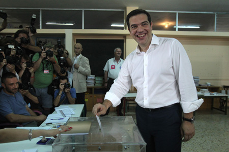 7月5日,在希臘雅典,希臘總理齊普拉斯在一家投票站投票。 希臘5日舉行全民公決,以決定是否接受債權(quán)人早先提出的協(xié)議草案,這將對如何解決希臘債務(wù)危機乃至希臘的歐元區(qū)地位產(chǎn)生重要影響。公決初步結(jié)果擬于當晚宣布。