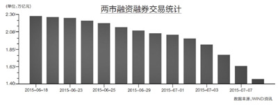 在前期的連續(xù)下跌之下,A股正經(jīng)歷快速的去杠桿過程。WIND統(tǒng)計數(shù)據(jù)顯示,截至7月8日收盤,滬深兩市的融資融券余額為14586億元,較前一個交易日大幅下降了1700億元,自今年6月18日達到22730億元的最高點后,兩融余額便連續(xù)下滑,短短13個交易日驟然縮水了8144億元,目前,滬深兩市的融資融券余額已經(jīng)下降到了今年3月底的水平。