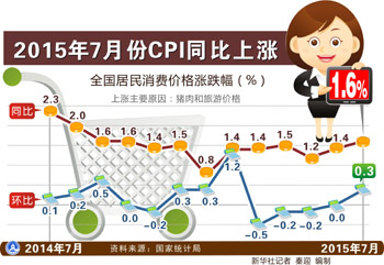 ??? 受國內(nèi)“豬周期”及國際大宗商品價(jià)格暴跌影響,我國居民消費(fèi)價(jià)格指數(shù)(CPI)和工業(yè)生產(chǎn)者出廠價(jià)格指數(shù)(PPI)走勢進(jìn)一步分化。國家統(tǒng)計(jì)局9日公布數(shù)據(jù)顯示,7月我國CPI同比上漲1.6%,漲幅連續(xù)第二個(gè)月擴(kuò)大,較6月增加0.2個(gè)百分點(diǎn),創(chuàng)下9個(gè)月來新高;PPI同比下降5.4%,跌幅連續(xù)第二個(gè)月擴(kuò)大,較6月降低0.6個(gè)百分點(diǎn),連續(xù)第41個(gè)月負(fù)增長。