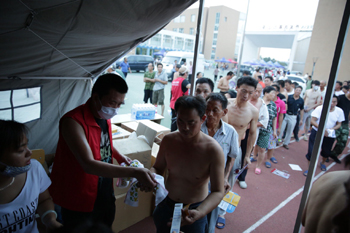 ??? 8月13日,應(yīng)急疏散的群眾在天津?yàn)I海新區(qū)開(kāi)發(fā)區(qū)第二小學(xué)安置點(diǎn)領(lǐng)取生活用品。記者 才揚(yáng) 攝 |