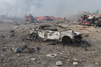圖為爆炸現(xiàn)場(chǎng)汽車殘骸?!∮浾?金立旺/攝