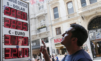 8月18日,在土耳其伊斯坦布爾,一名男子注視匯率顯示屏。土耳其里拉對美元匯率18日再創(chuàng)歷史新低,跌至1美元兌換2.906里拉。自今年初迄今,里拉對美元貶值約20%,為貶值最嚴(yán)重的新興市場貨幣之一。同日,土耳其中央銀行決定,維持今年5月以來的利率水平。 新華社/歐新中文 |