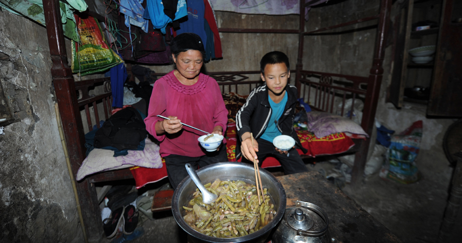 貴州省畢節(jié)市七星關(guān)區(qū)田坎鄉(xiāng)田坎村的瑞瑞是一名留守兒童,12歲的他和70歲的奶奶住在一間土坯房中。記者日前在他家里看到,房間里不但堆滿了廢品,還到處都是雞的糞便,充斥著一股濃烈的腐臭氣味。但即便這樣的房子也還是別人的。瑞瑞家的房子因年久失修成為危房,去年村里一位好心人擔(dān)心他們的安全將房子借給他們住。瑞瑞的爸爸三年前外出打工,但卻有一年多沒和家里聯(lián)系,媽媽兩年前改嫁到四川。記者看到,祖孫二人的午飯是由瑞瑞做的,主食為苞谷飯、菜是素瓜豆。他告訴記者,上學(xué)期間6點(diǎn)多就要起床,第一件事就是做飯,晚飯也是自己做。