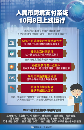 人民幣國際化進(jìn)程再次迎來里程碑式事件。10月8日,人民幣跨境支付系統(tǒng)(一期)成功上線運行。人民幣跨境支付系統(tǒng)英文簡稱為CIPS,為境內(nèi)外金融機(jī)構(gòu)人民幣跨境和離岸業(yè)務(wù)提供資金清算、結(jié)算服務(wù),是重要的金融基礎(chǔ)設(shè)施,也是人民幣國際化的有力支撐點。