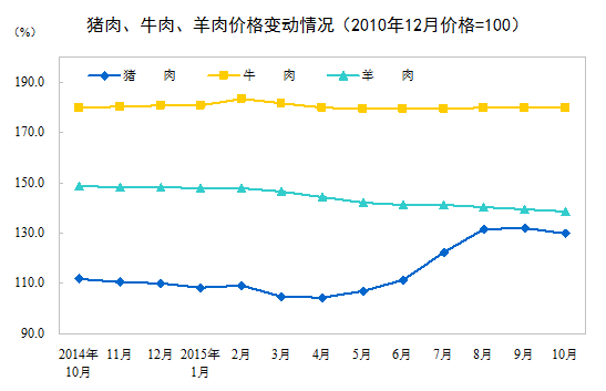 2015年10月份,全國(guó)居民消費(fèi)價(jià)格總水平同比上漲1.3%。其中,城市上漲1.3%,農(nóng)村上漲1.2%;食品價(jià)格上漲1.9%,非食品價(jià)格上漲0.9%;消費(fèi)品價(jià)格上漲1.0%,服務(wù)價(jià)格上漲1.9%。1-10月平均,全國(guó)居民消費(fèi)價(jià)格總水平比去年同期上漲1.4%。