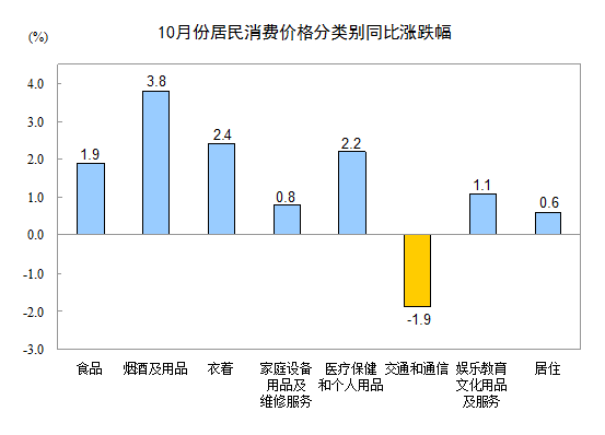 10月份,非食品價(jià)格同比上漲0.9%。其中,煙酒及用品、衣著、醫(yī)療保健和個(gè)人用品、娛樂(lè)教育文化用品及服務(wù)、家庭設(shè)備用品及維修服務(wù)、居住價(jià)格分別上漲3.8%、2.4%、2.2%、1.1%、0.8%和0.6%;交通和通信價(jià)格下降1.9%。