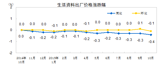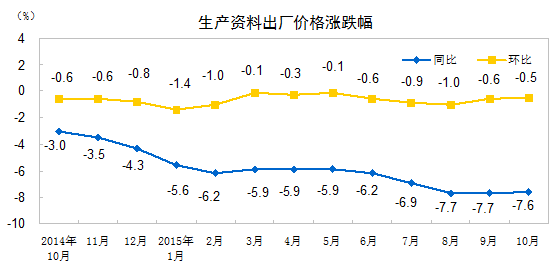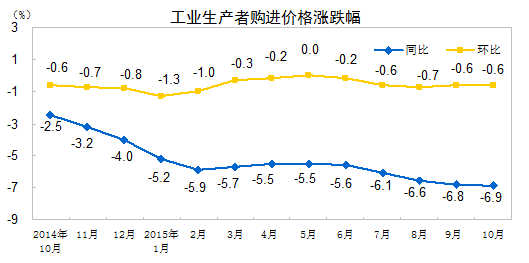 2015年10月份,全國(guó)工業(yè)生產(chǎn)者出廠價(jià)格環(huán)比下降0.4%,同比下降5.9%。工業(yè)生產(chǎn)者購(gòu)進(jìn)價(jià)格環(huán)比下降0.6%,同比下降6.9%。1-10月平均,工業(yè)生產(chǎn)者出廠價(jià)格同比下降5.1%,工業(yè)生產(chǎn)者購(gòu)進(jìn)價(jià)格同比下降6.0%。