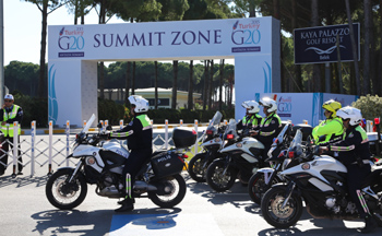11月11日,在土耳其安塔利亞,警察在二十國集團領(lǐng)導人第十次會議主會場區(qū)域內(nèi)執(zhí)勤?!∮浾?鄒樂/攝 |