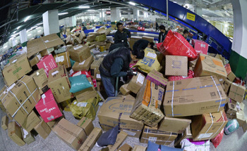 11月12日,在中國郵政寧夏分公司分揀中心,工作人員在將快件包裹分類?!⌒氯A社記者 彭昭之/攝 |