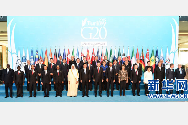 ??? 15日,二十國(guó)集團(tuán)領(lǐng)導(dǎo)人第十次峰會(huì)在土耳其安塔利亞舉行。國(guó)家主席習(xí)近平出席并發(fā)表題為《創(chuàng)新增長(zhǎng)路徑 共享發(fā)展成果》的重要講話,強(qiáng)調(diào)二十國(guó)集團(tuán)要加強(qiáng)宏觀經(jīng)濟(jì)政策溝通和協(xié)調(diào),推動(dòng)改革創(chuàng)新,構(gòu)建開(kāi)放型世界經(jīng)濟(jì),落實(shí)2030年可持續(xù)發(fā)展議程。