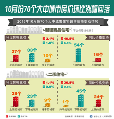 國家統(tǒng)計局10月份70個大中城市住宅銷售價格變動情況顯示,70個大中城市中,新建商品住宅價格下降的城市有33個,較9月增加了12個。這意味著,自今年2月起,新建商品住宅價格環(huán)比下降城市數(shù)量持續(xù)減少7個月后再次上升。