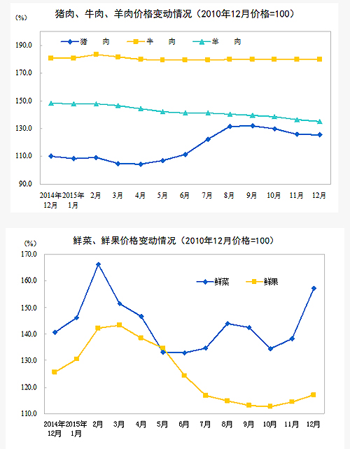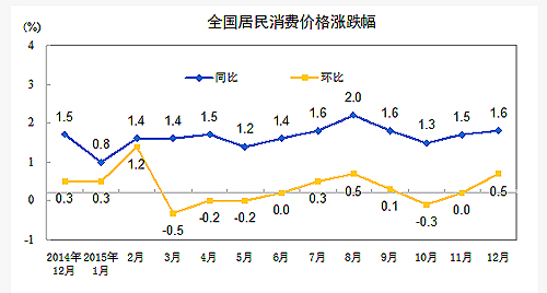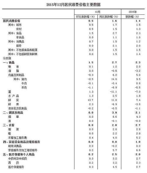 2015年12月份,全國居民消費(fèi)價(jià)格總水平同比上漲1.6%。其中,城市上漲1.7%,農(nóng)村上漲1.5%;食品價(jià)格上漲2.7%,非食品價(jià)格上漲1.1%;消費(fèi)品價(jià)格上漲1.5%,服務(wù)價(jià)格上漲2.1%。2015年,全國居民消費(fèi)價(jià)格總水平比上年上漲1.4%。
