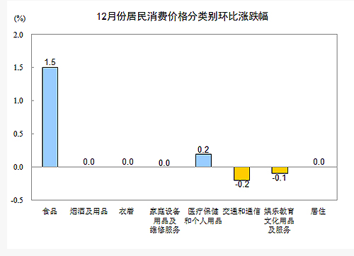 12月份,全國居民消費(fèi)價(jià)格總水平環(huán)比上漲0.5%。其中,城市上漲0.5%,農(nóng)村上漲0.5%;食品價(jià)格上漲1.5%,非食品價(jià)格持平;消費(fèi)品價(jià)格上漲0.7%,服務(wù)價(jià)格持平。