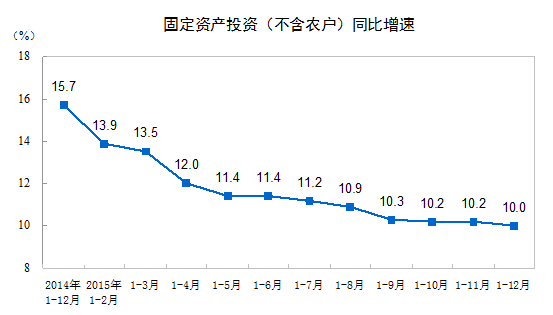 2015年,全國(guó)固定資產(chǎn)投資(不含農(nóng)戶)551590億元,比上年名義增長(zhǎng)10%(扣除價(jià)格因素,實(shí)際增長(zhǎng)12%),增速比1-11月份回落0.2個(gè)百分點(diǎn)。從環(huán)比速度看,12月份固定資產(chǎn)投資(不含農(nóng)戶)增長(zhǎng)0.68%。