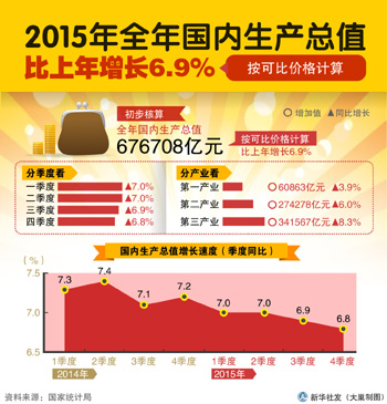 國(guó)家統(tǒng)計(jì)局19日公布2015年國(guó)民經(jīng)濟(jì)運(yùn)行情況。根據(jù)初步核算,全年國(guó)內(nèi)生產(chǎn)總值676708億元,按可比價(jià)格計(jì)算,比上年增長(zhǎng)6.9%,增速創(chuàng)下25年新低。