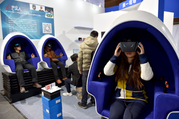觀(guān)眾在科技體驗(yàn)展上體驗(yàn)虛擬現(xiàn)實(shí)產(chǎn)品?!⌒氯A社記者 李鑫/攝? |
