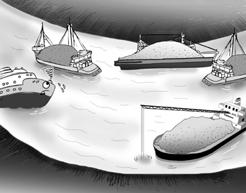 洞庭湖出口處至洞庭湖大橋水道,儼然已成采砂業(yè)的“集貿(mào)市場”?!督?jīng)濟參考報》記者在這里看到,上百艘運砂船、挖砂船在進(jìn)行交易。航運業(yè)內(nèi)將從洞庭湖大橋下通過叫“練梅花樁”,稍有不慎就會發(fā)生船只碰撞甚至傾覆的事故,從湘資沅澧四水匯入洞庭湖的船只大多不得不由此“過關(guān)”,最后匯入長江。