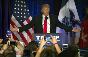 2月1日,美國共和黨總統(tǒng)候選人唐納德·特朗普在美國艾奧瓦州錫達拉皮茲參加競選活動。美國中西部的艾奧瓦州1日晚舉行2016年總統(tǒng)選舉首場黨內(nèi)預選,打響今年美國總統(tǒng)大選的第一槍?!⌒氯A社/歐新中文? |