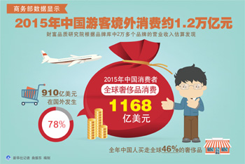 火爆的出境游帶動了海外消費。國家旅游局數(shù)據(jù)顯示,2015年,中國出境旅游達1.2億人次,出境人次和消費均列世界第一。商務部數(shù)據(jù)顯示,2015年中國游客在境外消費約1.2萬億元,繼續(xù)保持世界主要旅游消費群體稱號。