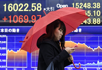 2月15日,一名女子在日本東京經(jīng)過一塊股指顯示屏。受上周末歐美股市大漲、國際油價上升、日元貶值及投資者逢低買入操作等多重利好因素刺激,東京股市日經(jīng)225種股票平均價格指數(shù)15日飆升千余點至16000點關(guān)口以上,漲幅達7.16%。 新華社/歐新中文? |