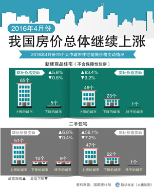 國家統(tǒng)計(jì)局城市司高級統(tǒng)計(jì)師劉建偉表示,無論從上漲城市數(shù)量還是漲幅都可以看出,房價(jià)整體在上漲。發(fā)布的數(shù)據(jù)顯示,4月70個(gè)大中城市新建商品住宅價(jià)格環(huán)比上漲的城市有65個(gè),比上月增加3個(gè),下降的城市有5個(gè),比上月減少3個(gè);環(huán)比漲幅在1%以上的城市有22個(gè),比上月增加4個(gè),環(huán)比漲幅在5%以上的城市有2個(gè),比上月增加1個(gè);最高漲幅為5.8%,比上月擴(kuò)大0.4個(gè)百分點(diǎn)。