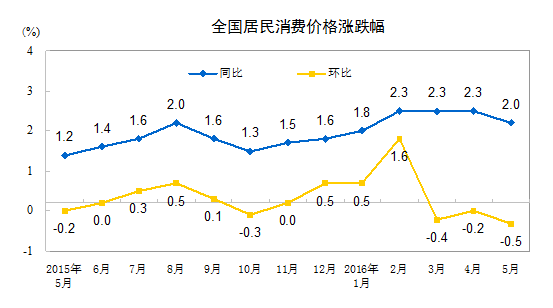 2016年5月份,全國居民消費(fèi)價(jià)格總水平同比上漲2.0%。其中,城市上漲2.0%,農(nóng)村上漲2.1%;食品價(jià)格上漲5.9%,非食品價(jià)格上漲1.1%;消費(fèi)品價(jià)格上漲2.0%,服務(wù)價(jià)格上漲2.1%。1-5月平均,全國居民消費(fèi)價(jià)格總水平比去年同期上漲2.1%。
