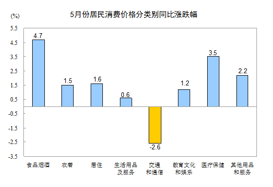 5月份,其他七大類價(jià)格同比六漲一降。其中,醫(yī)療保健、其他用品和服務(wù)、居住、衣著、教育文化和娛樂、生活用品及服務(wù)價(jià)格分別上漲3.5%、2.2%、1.6%、1.5%、1.2%、0.6%;交通和通信價(jià)格下降2.6%。
