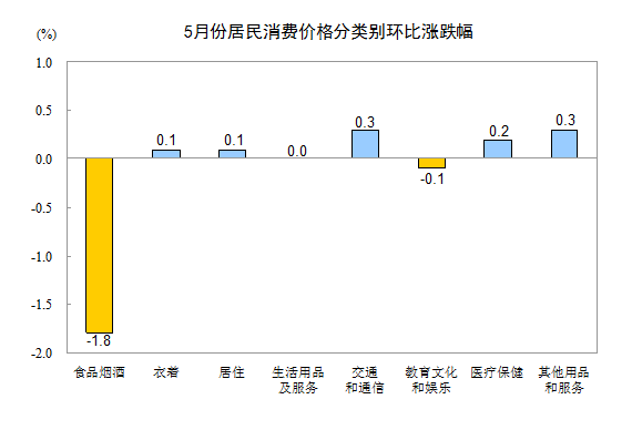 5月份,全國居民消費(fèi)價(jià)格總水平環(huán)比下降0.5%。其中,城市下降0.5%,農(nóng)村下降0.4%;食品價(jià)格下降2.7%,非食品價(jià)格上漲0.1%;消費(fèi)品價(jià)格下降0.7%,服務(wù)價(jià)格持平。