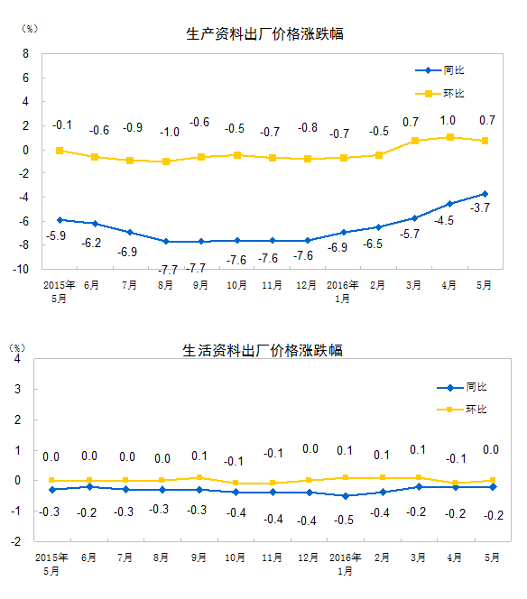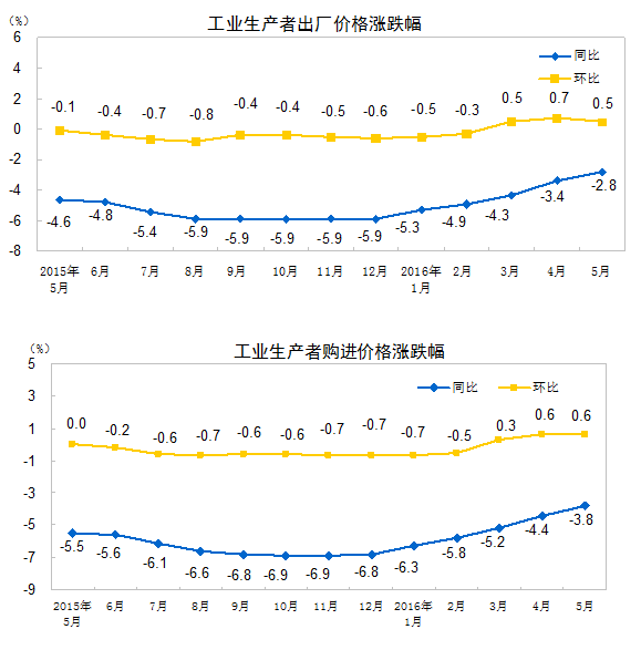 2016年5月份,全國工業(yè)生產(chǎn)者出廠價格環(huán)比上漲0.5%,同比下降2.8%。工業(yè)生產(chǎn)者購進(jìn)價格環(huán)比上漲0.6%,同比下降3.8%。1-5月平均,工業(yè)生產(chǎn)者出廠價格同比下降4.1%,工業(yè)生產(chǎn)者購進(jìn)價格同比下降5.1%。