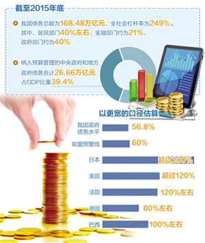 據(jù)統(tǒng)計,截至2015年末,我國納入預(yù)算管理的中央政府債務(wù)10.66萬億元,地方政府債務(wù)16萬億元,合計政府債務(wù)26.66萬億元,占GDP比重為39.4%。如果把地方融資平臺加進來,以更寬的口徑估算,政府債務(wù)水平達到56.8%,仍低于歐盟60%的警戒線,也低于當(dāng)前主要市場經(jīng)濟國家和新興市場國家水平,比如,日本超過200%、美國超過120%、法國120%左右、德國80%左右、巴西100%左右。