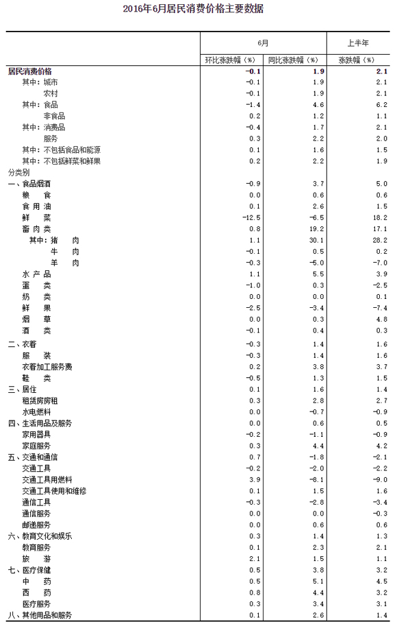 2016年6月份,全國居民消費價格總水平同比上漲1.9%。其中,城市上漲1.9%,農(nóng)村上漲1.9%;食品價格上漲4.6%,非食品價格上漲1.2%;消費品價格上漲1.7%,服務(wù)價格上漲2.2%。上半年,全國居民消費價格總水平比去年同期上漲2.1%。