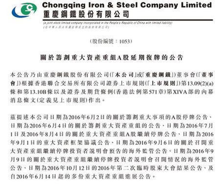 重慶鋼鐵11月1日發(fā)布公告稱,鑒于本次重組所涉及的資產(chǎn)規(guī)模較大,方案論證復(fù)雜;且為重大無先例事項,涉及到的具體問題正在向相關(guān)監(jiān)管部門進行咨詢,且方案的實施尚需取得多個監(jiān)管部門的批準和認可,公司預(yù)計無法于2016年11月2日復(fù)牌。公司自2016年11月2日開市起繼續(xù)停牌,繼續(xù)停牌時間不超過六個月。