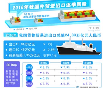 海關(guān)總署新聞發(fā)言人黃頌平表示,2016年全球經(jīng)濟(jì)仍處于國際金融危機(jī)后的深度調(diào)整期,經(jīng)濟(jì)復(fù)蘇乏力,國際市場需求疲弱,我國對外貿(mào)易發(fā)展面臨的不確定因素明顯增多,下行壓力加大,總體形勢復(fù)雜嚴(yán)峻。隨著國家促進(jìn)外貿(mào)回穩(wěn)向好政策措施效果的逐步顯現(xiàn),一季度我國外貿(mào)進(jìn)出口值明顯下降,二季度出現(xiàn)企穩(wěn),三四季度持續(xù)實(shí)現(xiàn)正增長,全年呈現(xiàn)前低后高、穩(wěn)中向好的走勢。