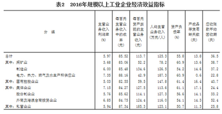 2016年,規(guī)模以上工業(yè)企業(yè)每百元主營(yíng)業(yè)務(wù)收入中的成本為85.52元,每百元資產(chǎn)實(shí)現(xiàn)的主營(yíng)業(yè)務(wù)收入為113.7元,人均主營(yíng)業(yè)務(wù)收入為125.3萬(wàn)元,產(chǎn)成品存貨周轉(zhuǎn)天數(shù)為13.8天,應(yīng)收賬款平均回收期為36.5天。