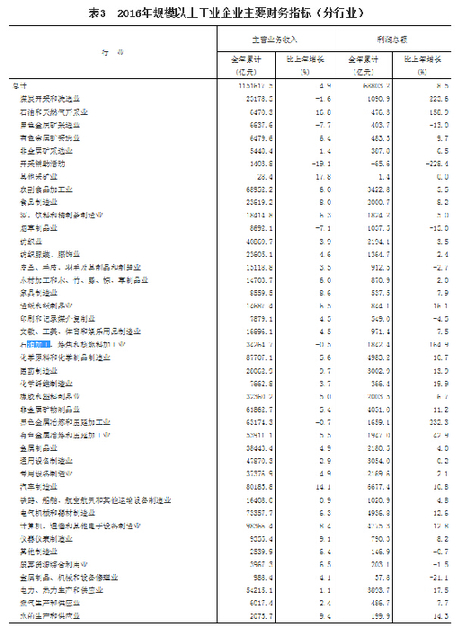2016年,在41個(gè)工業(yè)大類行業(yè)中,29個(gè)行業(yè)利潤(rùn)總額比上年增加,1個(gè)持平,11個(gè)減少。主要行業(yè)利潤(rùn)情況如下:煤炭開(kāi)采和洗選業(yè)利潤(rùn)總額比上年增長(zhǎng)2.2倍,農(nóng)副食品加工業(yè)增長(zhǎng)5.5%,紡織業(yè)增長(zhǎng)3.5%,石油加工、煉焦和核燃料加工業(yè)增長(zhǎng)1.6倍,化學(xué)原料和化學(xué)制品制造業(yè)增長(zhǎng)10.7%,非金屬礦物制品業(yè)增長(zhǎng)11.2%,黑色金屬冶煉和壓延加工業(yè)增長(zhǎng)2.3倍,有色金屬冶煉和壓延加工業(yè)增長(zhǎng)42.9%,通用設(shè)備制造業(yè)增長(zhǎng)0.2%,專用設(shè)備制造業(yè)增長(zhǎng)2.1%,汽車制造業(yè)增長(zhǎng)10.8%,電氣機(jī)械和器材制造業(yè)增長(zhǎng)12.6%,計(jì)算機(jī)、通信和其他電子設(shè)備制造業(yè)增長(zhǎng)12.8%,電力、熱力生產(chǎn)和供應(yīng)業(yè)下降17.5%,石油和天然氣開(kāi)采業(yè)由同期盈利轉(zhuǎn)為虧損。