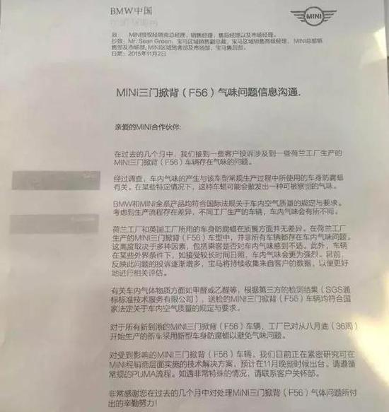 而在2015年11月,寶馬中國曾經(jīng)有一份關(guān)于《MINI三門掀背(F56)氣味問題信息溝通》的通告??梢钥闯?,寶馬經(jīng)過送檢結(jié)果顯示車內(nèi)空氣質(zhì)量符合要求,并稱異味、甲醛超標是由多種因素造成的,新產(chǎn)車型寶馬表示將采用新型車身防腐蠟避免異味產(chǎn)生。至于如何解決異味的車輛,寶馬中國再無下文!